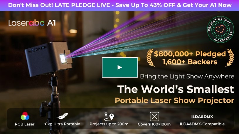 Portable 2W/5W RGB laser stage light, 200m throw, ILDA+DMX ready, app-controlled, and one-click setup for instant creative shows